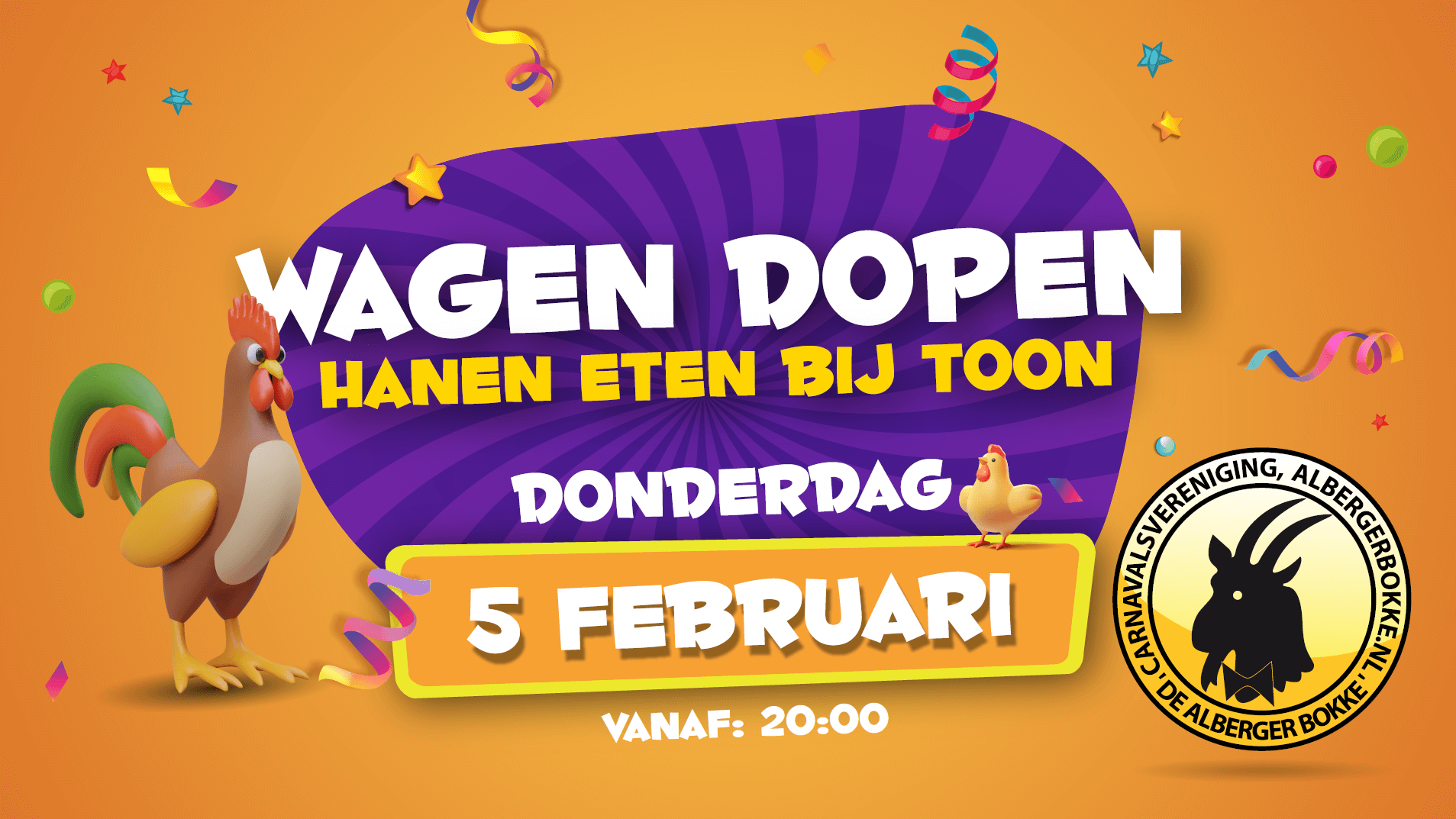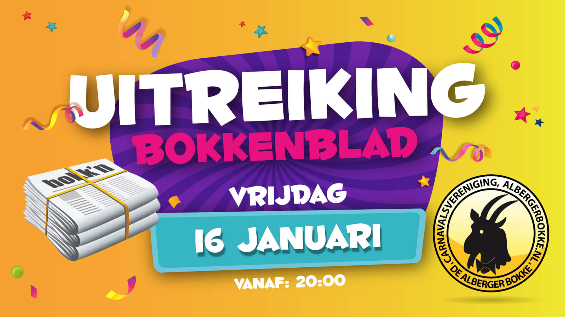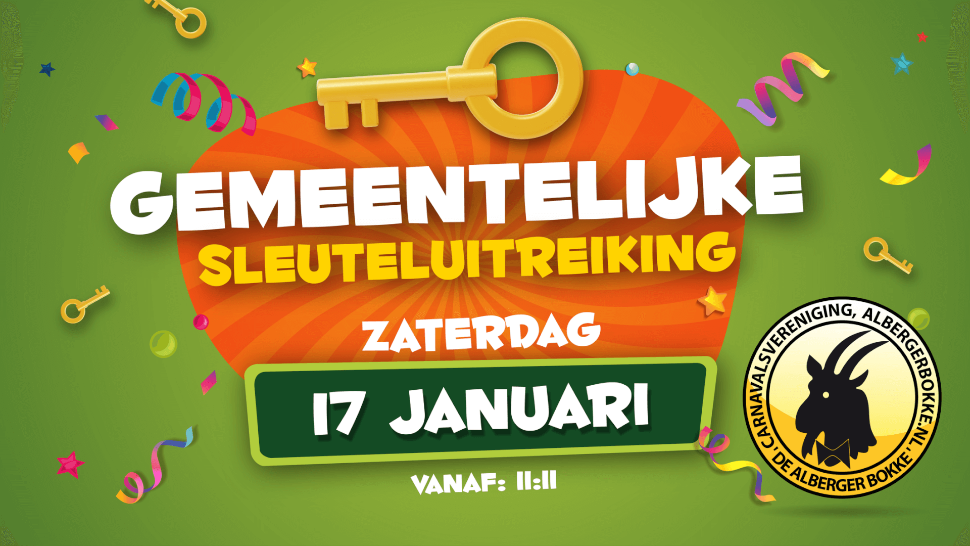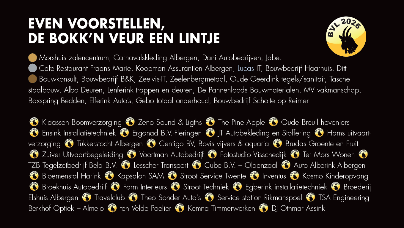 Prins Jeroen II (Meijer) en zijn Sik Nick (Oude Geerdink) en hofdame Linsey, regeren in het 56e jaar 2025-2026 over c.v. de Alberger Bökke. Jeugdprins Tim II (Van der Aa) en zijn Sik Bart (Morshuis) met hofdames Aniek (Loohuis) en Birgit (Stamsnijder) regeren over J.V.C. de Bokk’n Hörnkes.