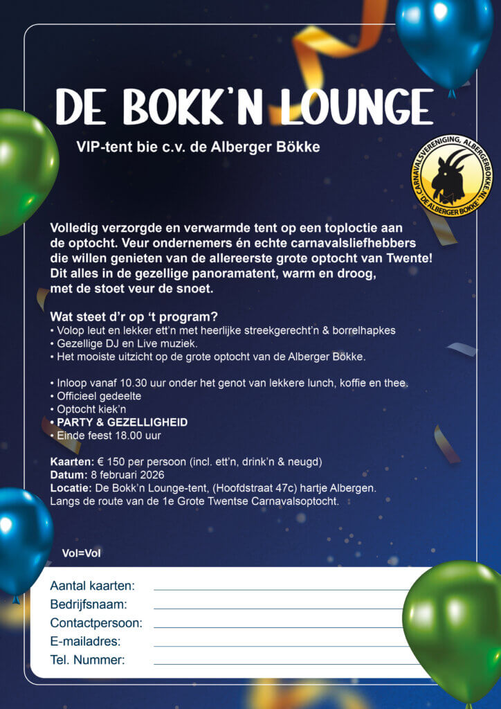 Volledig ontzorgd, een sfeervolle en te verwarmen tent en een A-locatie aan de route van de optocht. Zie hier een paar voorname ingrediënten van de Bokk’n Lounge, een nieuw initiatief van carnavalsvereniging De Alberger Bökke. De Eerste Grote Twentse Carnavalsoptocht voert op zondag 8 februari traditiegetrouw weer door de Albergse straten en mag al jaren tienduizenden belangstellenden verwelkomen. Zij die echter het geheel een keer op een andere manier willen beleven is er nu dus een uitgelezen kans. De organisatie heeft een programma met VIP-achtige allure in elkaar gezet en mikt voor de eerste editie op zo’n 120 tot 150 bezoekers.