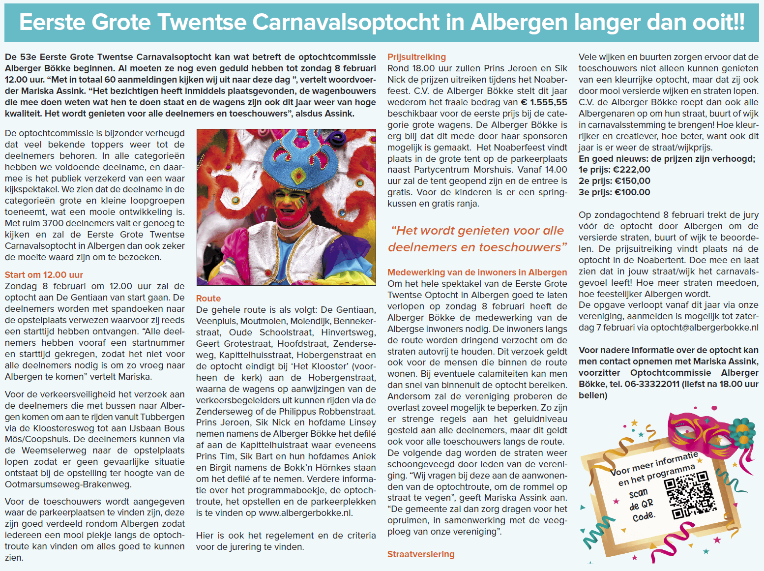 Voor nadere informatie over de optocht kan men contact opnemen met Mariska Assink, voorzitter Optochtcommissie Alberger Bökke, tel. 06-33322011 (liefst na 18.00 uur bellen).